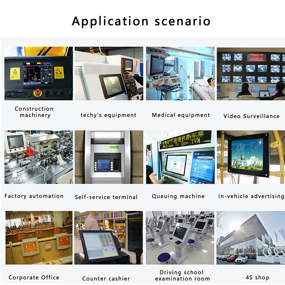 This product is widely used in industrial production workshop/engineering machinery/NC equipment/medical equipment/video surveillance/factory automation equipment/self-service terminal/vehicle advertising machine and other scenes or fields.
